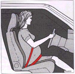 Pregnant women should always wear seat belts. Remember that the belt should always be positioned in such a way as to avoid any possible pressure on the abdomen. The lap portion of the belt should be located low, as shown in the above illustration.