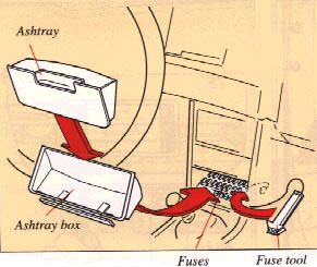 A blown fuse is indicated by the failure of all the units protected by it, and it is caused by overloading the circuits. The fuses (and relays) are located in the central electrical unit behind the ashtray in the center console.