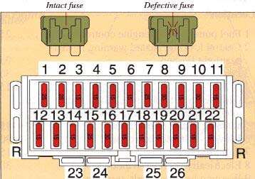 The fuses are removed by pulling them straight out. If they are defective, the metal wire is broken. When fitting a new fuse, be certain to use one with the same amperage and color as the one removed (see top of fuse)! Spare fuses are located on each side of the fusebox (1x15A, 1x25A, 1x30A).