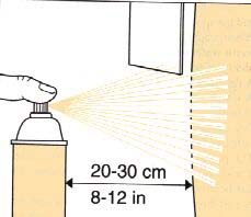 Shake the spray can for at least 1 minute. Spray on the primer. Move the can slowly and evenly back and forth over the spot and about 8-12 in. ( 20 - 30 cm) from the surface. Protect the surrounding surfaces with suitable paper.