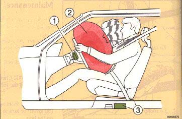 The airbag is folded and located in the center of the steering wheel. It is released only during certain frontal or front-angular collisions in which the forces sustained by the car are equivalent to an impact into a rigid barrier of approximately 12 mph (19 kph).