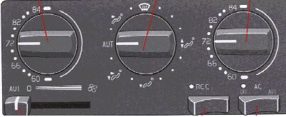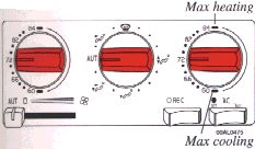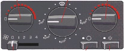 . and move the blower control to the position AUT (as far to the left as possible). The A/C system will be on at this time regardless of the A/C button's position and the blower will run at its maximum speed. When the windows have cleared, set the function selector in the AUT position.