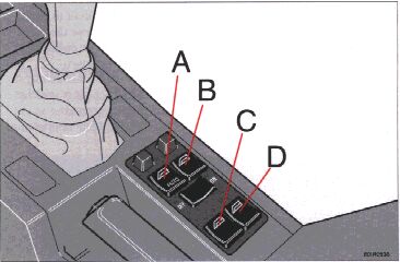 The electrically operated windows are controlled by switches in the center console as shown in the illustration above. The starting (ignition) switches must be ON (position II) for the electrically-operated windows to function. The window is lowered if the rear part of the switch is pressed and raised if the front part of the switch is pressed.