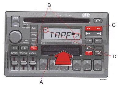 If the button is pressed the tape will stop and the cassette will be ejected. The radio will be automatically engaged. The radio, CD or CD changer will engage automatically (depending on which mode was activated before the tape was played).