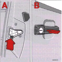 To avoid battery drain when the doors are opened for prolonged periods, these lights can be switched off by pressing the lock mechanism (A) located in the rear facing side of the driver's door. To return the lights to their normal function, pull the door handle out before closing the door (B).