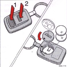 The remote transmitter is powered by 2 three-volt batteries, type CR 1220. If three short signals are audible from the transmitter each time you lock/unlock the car, this indicates that the batteries are weak.
