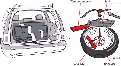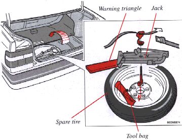 The spare tire and the jack are located beneath the floor mat in the large storage bin. Always secure the spare tire and the jack to prevent them from rattling (see illustration).