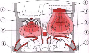 As an enhancement to the three-point seat belt system, your Volvo is equipped with a Supplemental Restraint System (SRS). The Volvo SRS consists of airbags (2) and knee bolsters (5) on both the driver's and passenger's sides and seat belt tensioners in both front door pillars (4). The system is designed to supplement the protection provided by the three-point seat belt system.