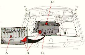 If a garage jack is used to lift the car, the two jack attachments points should be used. They are specially reinforced to bear the weight of the car. A garage jack can also be placed under the front of the engine support frame and under the reinforced plate in the spare wheel well. Take care not to damage the splash guard under the engine. Ensure that the jack is positioned so that the car cannot slide off it. Always use axle stands or similar structures.