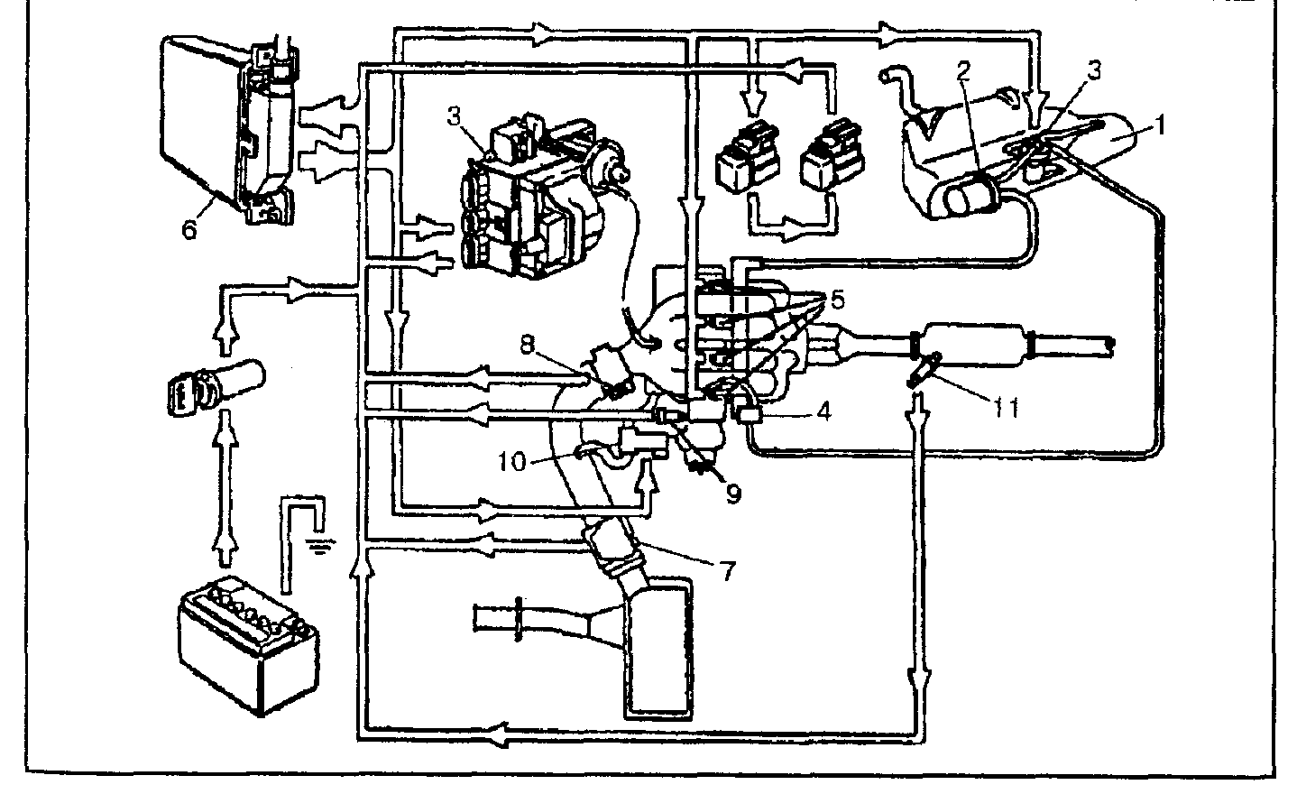 1 - топливный бак, 2 - фильтр тонкой очистки топлива, 3 - топливный насос, 4 - регулятор Давления топлива, 5 - рабочие форсунки, 6 - электронный блок управления, 7 - измеритель массы воздуха с нагреваемым проводником, 8 - выключатель положения дроссельной заслонки, 9 - датчик температуры охлаждающей жидкости, 10 - регулятор холостого хода, 11 - датчик концентрации кислорода (лямбда-зонд)